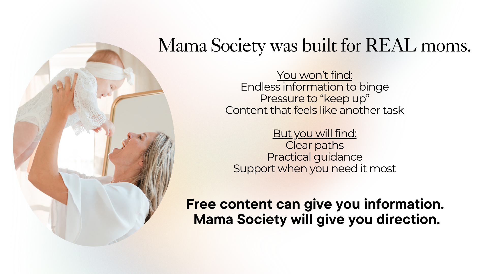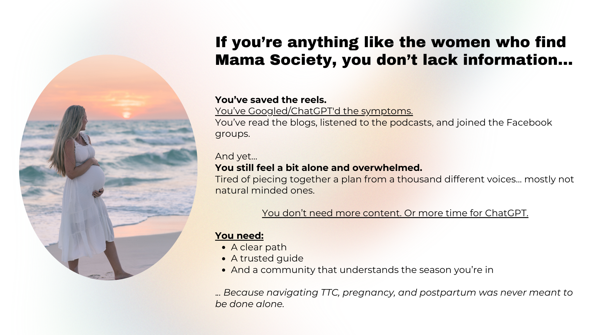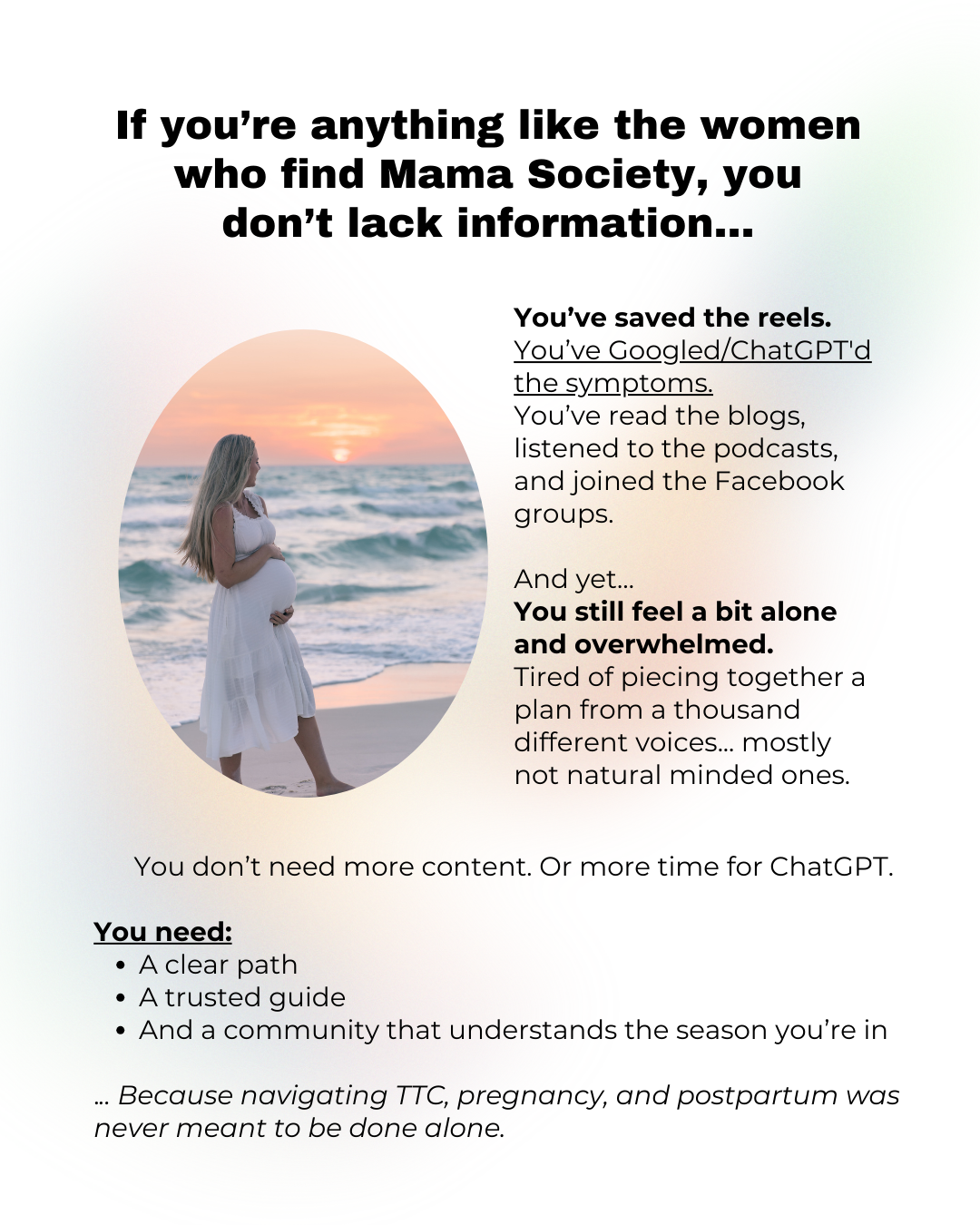 Get immediate access to everything within Mama Society (TTC support, pregnancy support, postpartum support, hormone support + a private community to walk through it with others)